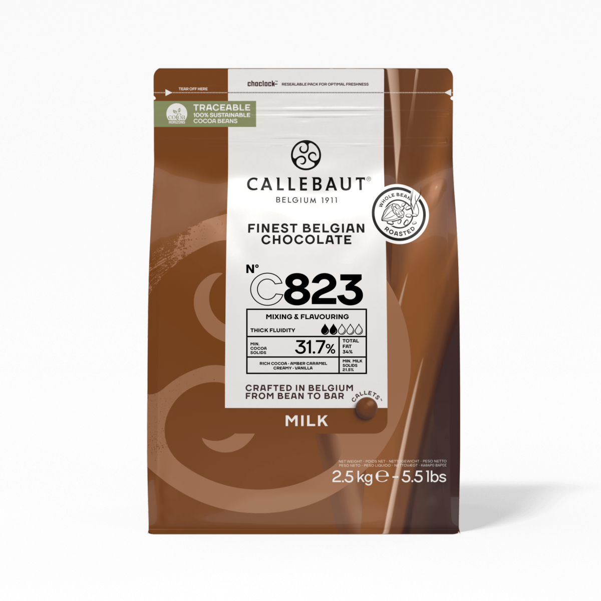 Deze melkchocolade heeft dezelfde warme kleur, zachte cacaosmaak en een zoete karamelaccenten als de veelzijdige 823, maar dan met een lagere vloeibaarheid voor een extra volle smaak wanneer je mousses, ganaches en meer op smaak brengt.